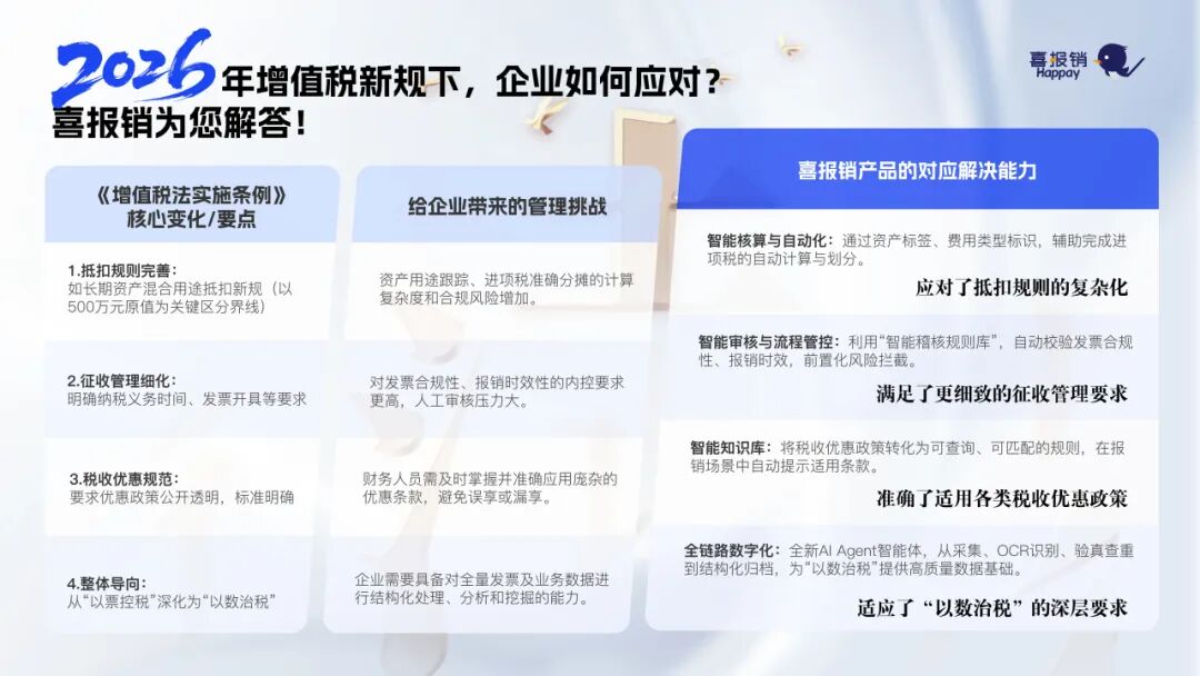 挑战:今年的新《增值税法实施条例》对抵扣规则、纳税义务时间有更细致的规定,企业在商旅消费、对公采购中,人工审核稍有不慎就可能引发抵扣风险或合规瑕疵。